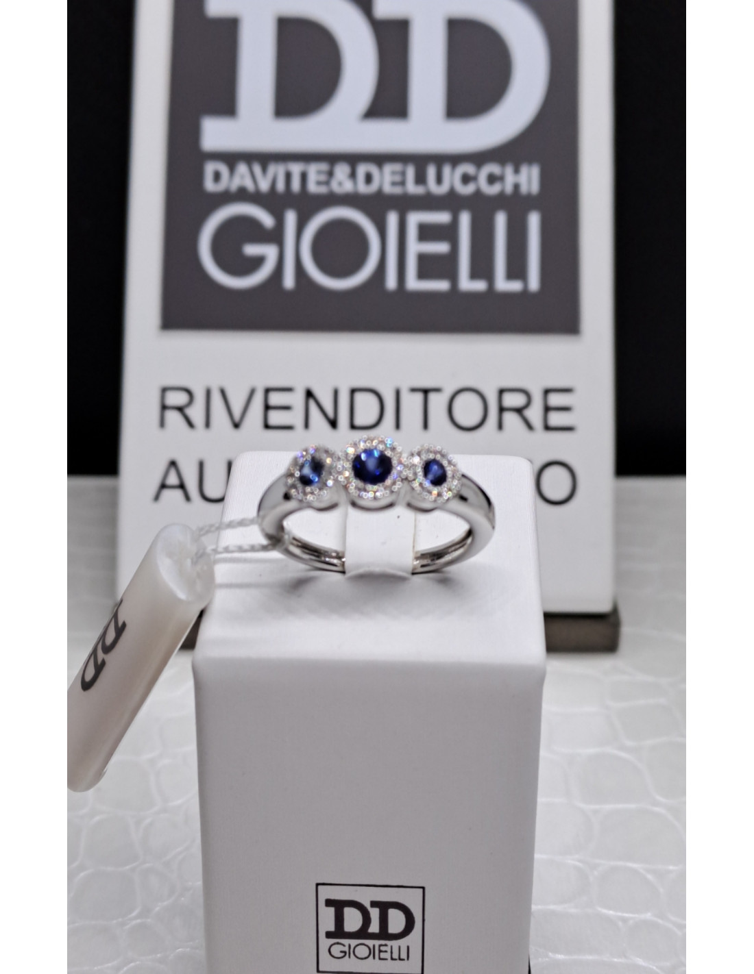 Anello donna oro bianco 750, diamanti e zaffiri