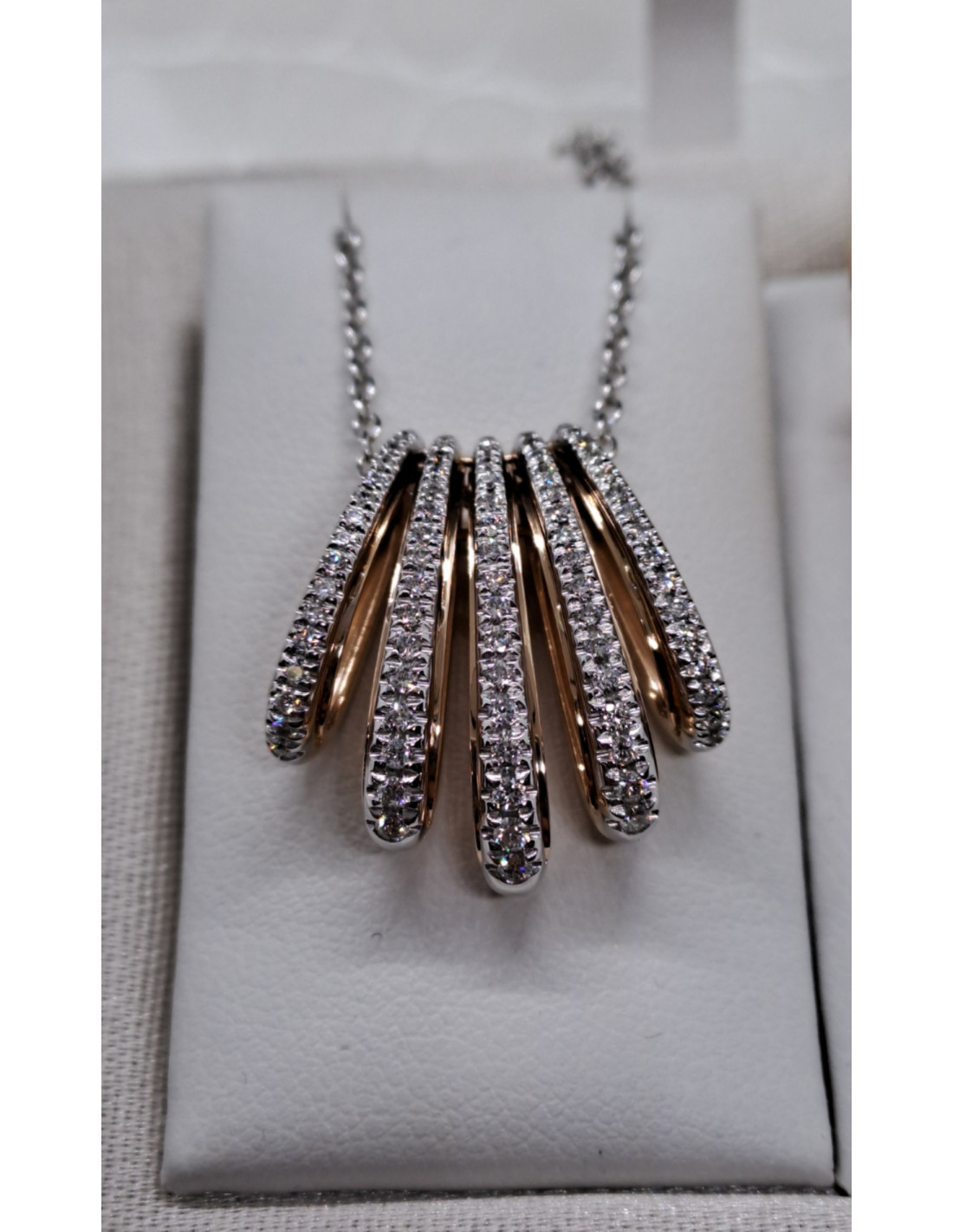 Scegli la nostra collana in oro bianco, rosa e diamanti per aggiungere un tocco di lusso e stile al tuo look. Non perdere l'occasione di possedere un gioiello unico e prezioso!